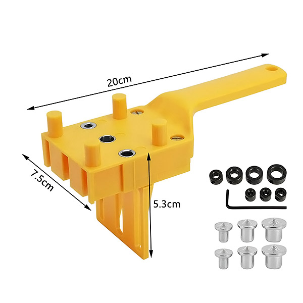Toto zařízení podporuje hmoždinky o průměru 6, 8 a 10 mm a pracuje se dřevem a dřevotřískovými deskami o tloušťce až 30 mm, takže je ideální pro širokou škálu projektů, od skříní až po montáž domácího nábytku. Jeho lehká a praktická konstrukce umožňuje snadnou manipulaci, ať už pracujete na stavebních nebo truhlářských úkolech.