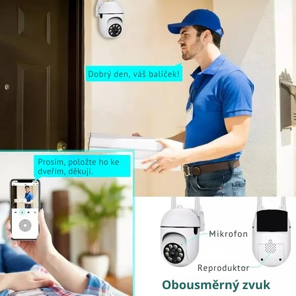 Díky vestavěnému responzivnímu mikrofonu v této bezpečnostní outdoorové kameře můžete pomocí naší aplikace nejen poslouchat, ale také mluvit. Obousměrný zvuk vám umožní komunikovat s přáteli a detekční poplachový systém vás zase zbaví nezvaných hostů nebo zvířat.